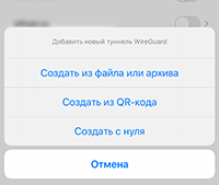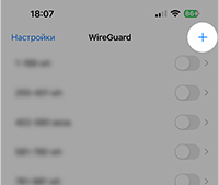 В приложении WireGuard нажмите в правом верхнем углу + для добавления туннеля связи