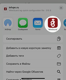 При скачивании выберите программу WireGuard, после чего в приложении появится новое соединение. Нажмите кнопку ВКЛ для использования.