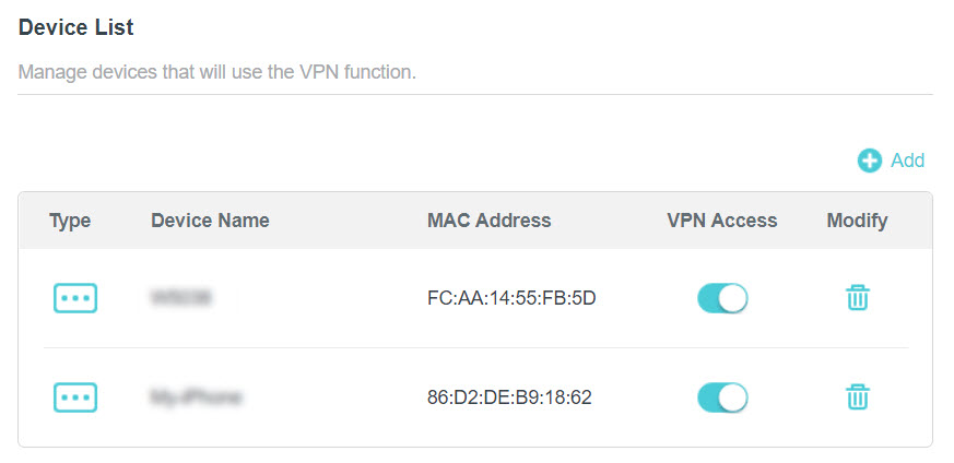 Проверьте и включите WireGuard в списке серверов, добавьте и включите VPN доступ для устройств, которые будут использовать функцию VPN.