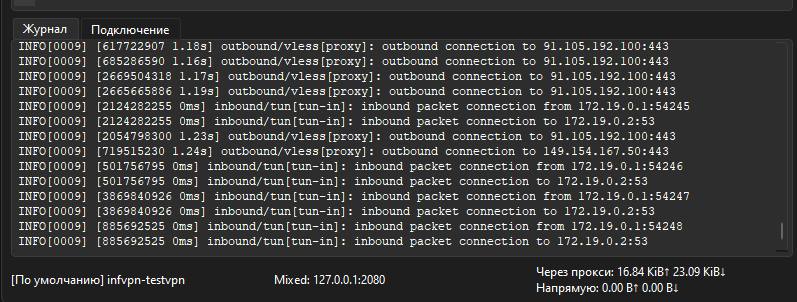 При успешном запуске VPN в левом нижнем углу статус "Не запущен" должен сменится на имя вашего ключа и вкладка Журнал должна активно пополняться логами.