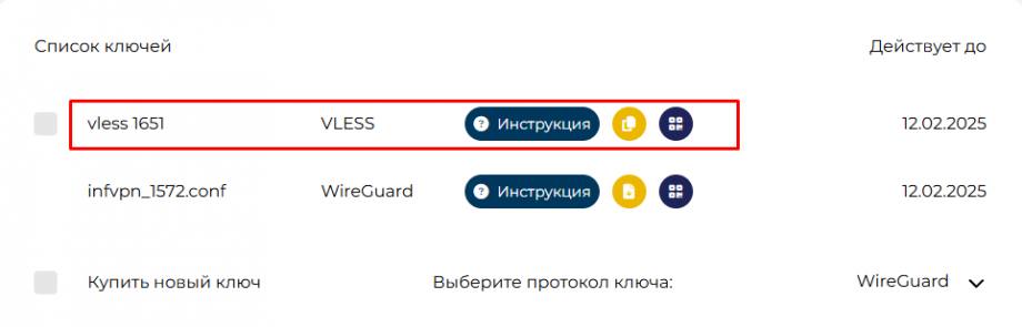 Далее Вам будет выдан ключ протокола VLESS, который вы сможете использовать на втором устройстве.